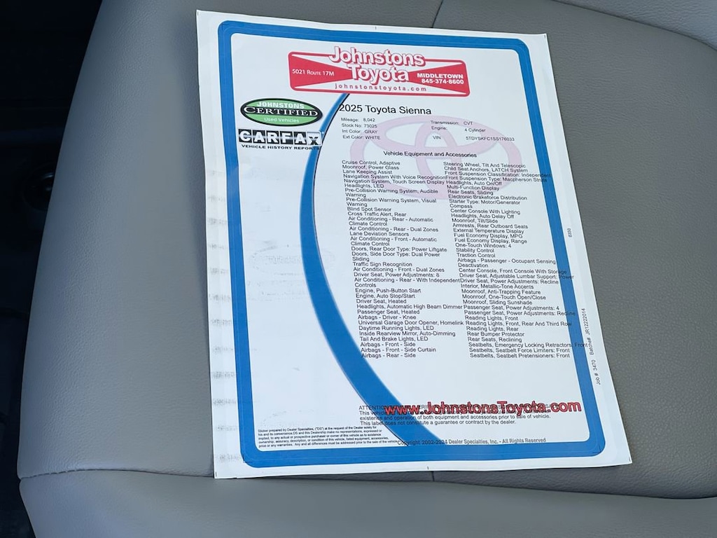 This vehicle is a 2025 Toyota Sienna Mini Van all wheel drive, with low mileage of 8,042 miles. It has a white exterior and gray interior, and is powered by a 2.5 liter 4 cylinder engine with a crash test rating of 5 out of 5 stars. Vehicle features include blind spot sensor, hill start assist, on demand four wheel drive, navigation system with voice recognition, and navigation with touch screen display. This car is truly state-of-the-art and will surely make any journey an enjoyable one. Johnstons Toyota is located in New Hampton, NY and proudly serves Warwick, Middletown, and Newburgh, New York. We are a premier Toyota Dealer in New York providing a full line of new and used cars , trucks, vans, and SUVs.
